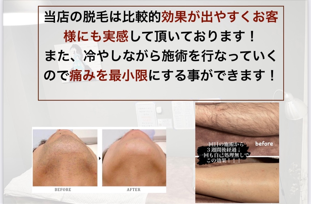だいたい平均で髭脱毛だと3回目ぐらいから、足脱毛や腕脱毛などは1回で効果を実感されるからが多いです!
